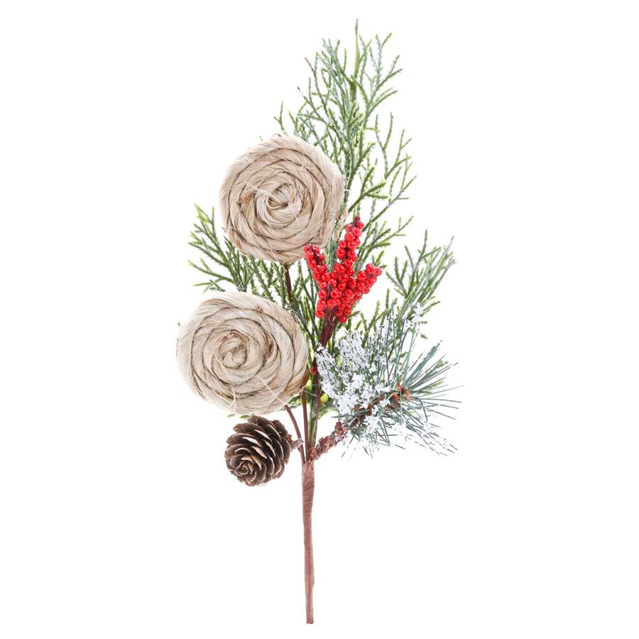 O galho artificial, possuí frutinhas vermelhas, u,a mini pinha marrom, folhas verdes, um cabo marrom e dois enfeites bege.