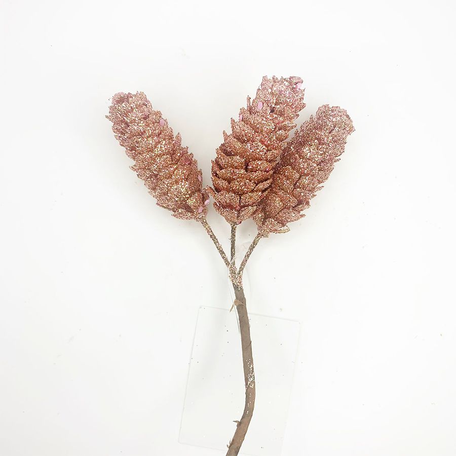 O pick imita um galho artificial com três pinhas revesttidas com gliter rosa ou rose gold. Seu cabo é marrom.