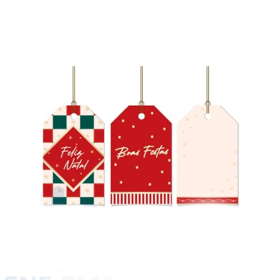 A tag é da cor vermelha, uma delas é vermelha com bolinhas douradas e a frase "Boas Festas" escrita em branco e na outra um quadriculado verde,vermelho e branco, com a frase "Feliz Natal" escrita no centro.