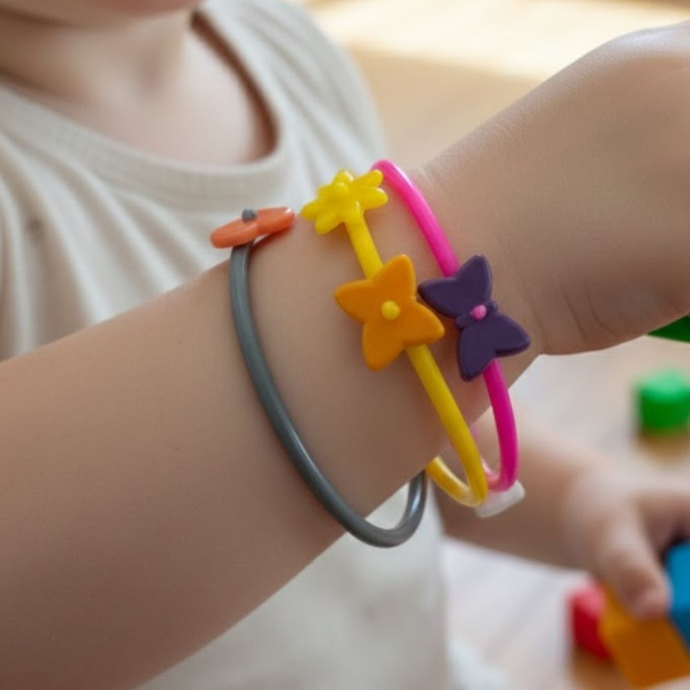 A pulseira flor sortida é um acessório delicado e encantador, ideal para complementar lembrancinhas e kits infantis. Com aproximadamente 6,5x6,5cm, possui formato de argola simples com detalhes decorativos como flores, corações e pequenos enfeites que dão um charme especial à peça.