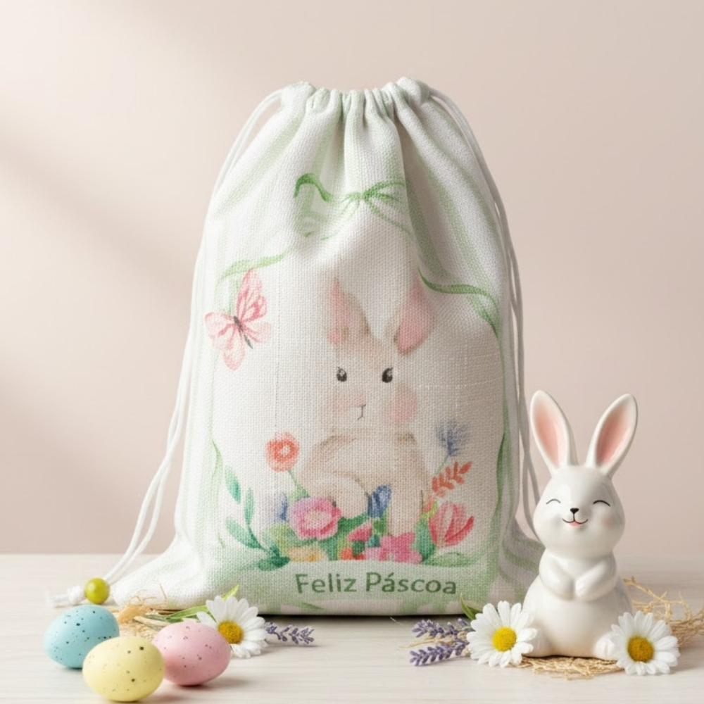Confeccionado em algodão, o saco é leve, resistente e reutilizável, oferecendo praticidade e charme na apresentação. No tamanho 22x18cm, acomoda com facilidade ovos de chocolate, kits de Páscoa, doces artesanais e presentes, valorizando o conteúdo com um toque artesanal e especial.