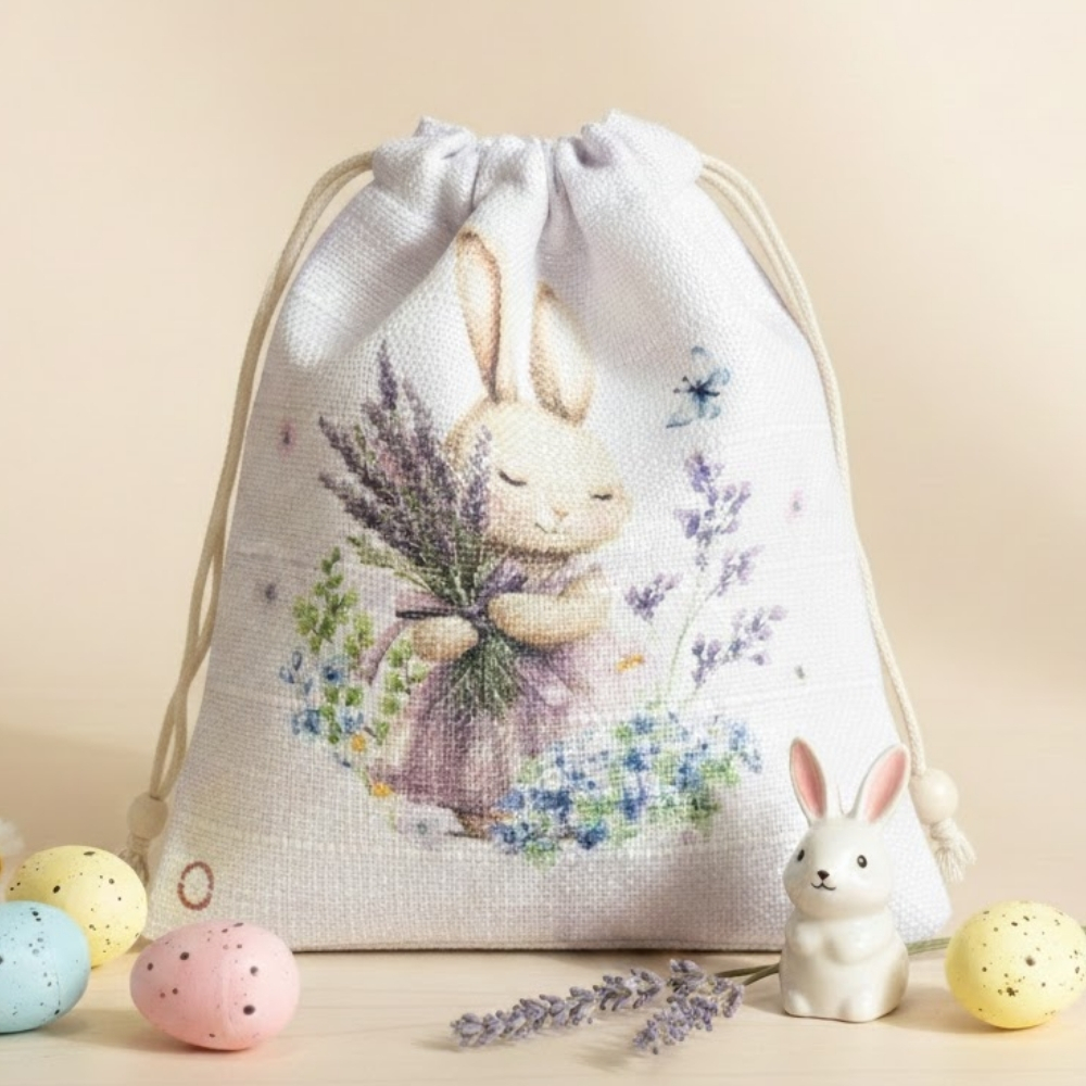 Delicado e poético, o saco de algodão Provencial Lilás é perfeito para composições suaves e românticas de Páscoa. A peça apresenta um elegante efeito aquarela em lilás com branco, criando um visual leve e sofisticado. No centro, a estampa traz um coelhinho com flores, segurando um punhado de lavandas, transmitindo sensação de calma, delicadeza e encanto.
