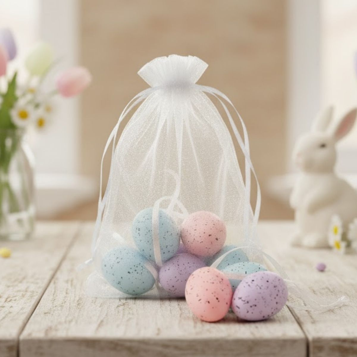 Os ovinhos vêm acondicionados em um saquinho de organza branco, que pode ser usado para armazenar ou até mesmo presentear. É uma decoração versátil e encantadora, ideal para árvores de Páscoa, guirlandas, cestas ou centros de mesa, trazendo um toque artesanal e festivo para o ambiente.