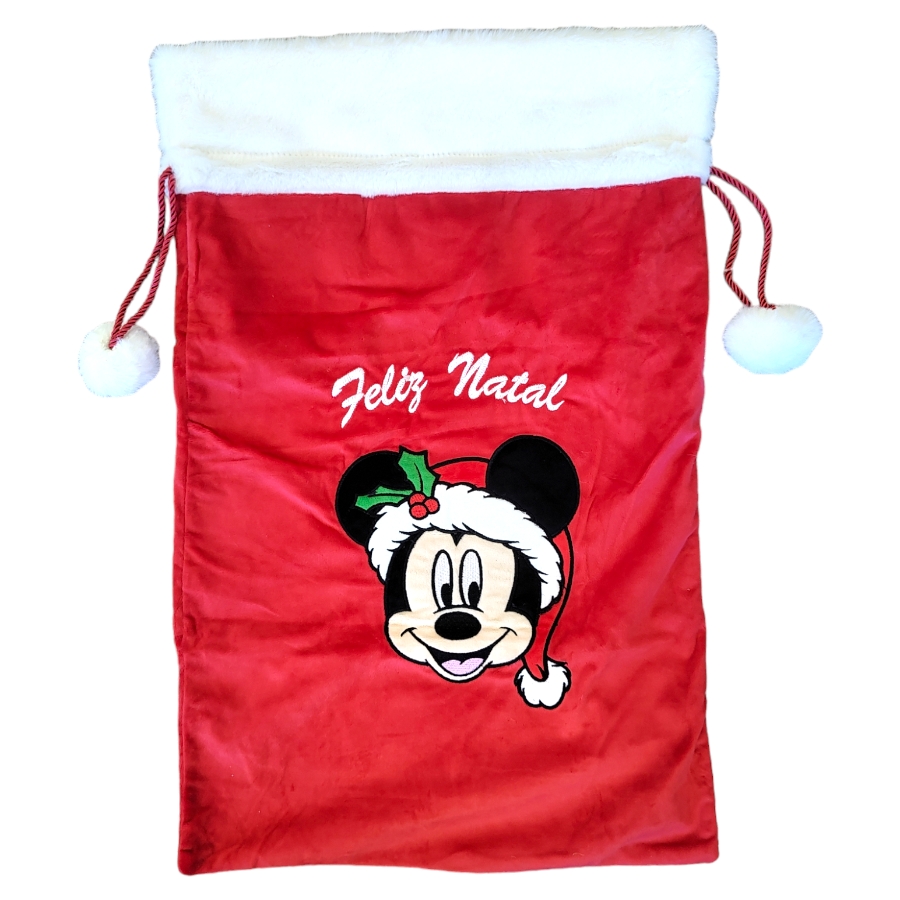 Saco de presente em tecido vermelho, com estampa do Mickey bordada