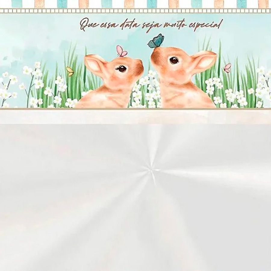 Saco Transparente para Cesta com barrado xadrez verde, com desenho de coelhos com borboletas no nariz e jardim com florzinhas brancas