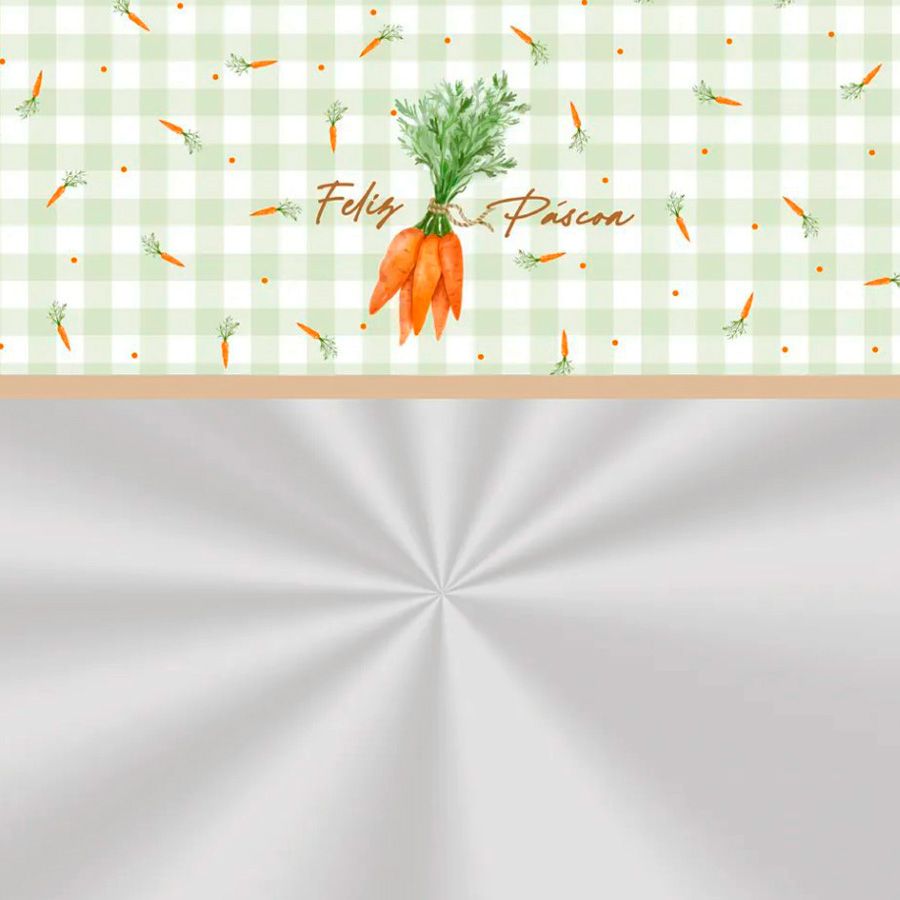 Saco Transparente para Cesta com barrado xadrez verde, mini desenhos de cenouras e escrito Feliz Páscoa com maço de cenoura no meio