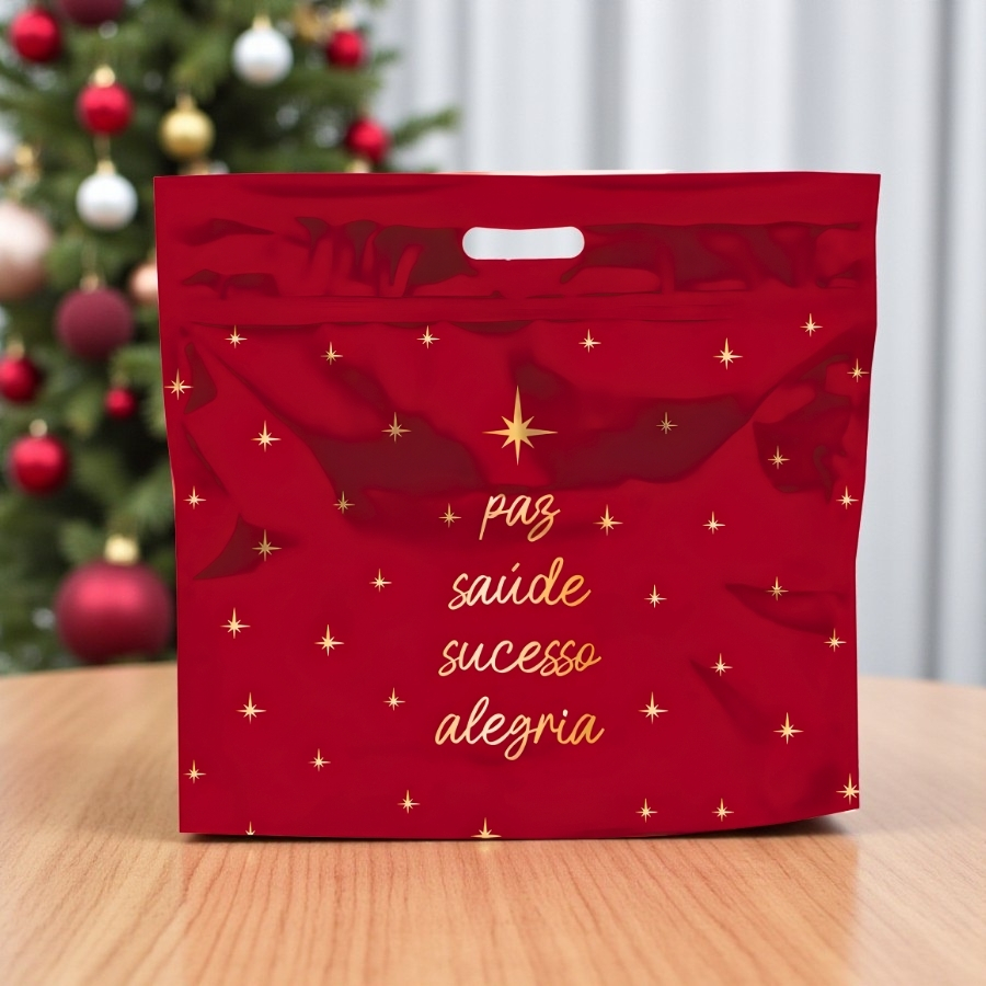 A Sacola de Natal Laminada com Fecho Desejos Vermelho e Ouro é ideal para embalar presentes de fim de ano com praticidade e elegância. Seu design natalino combina o tradicional vermelho com detalhes dourados, transmitindo charme e sofisticação em cada detalhe.