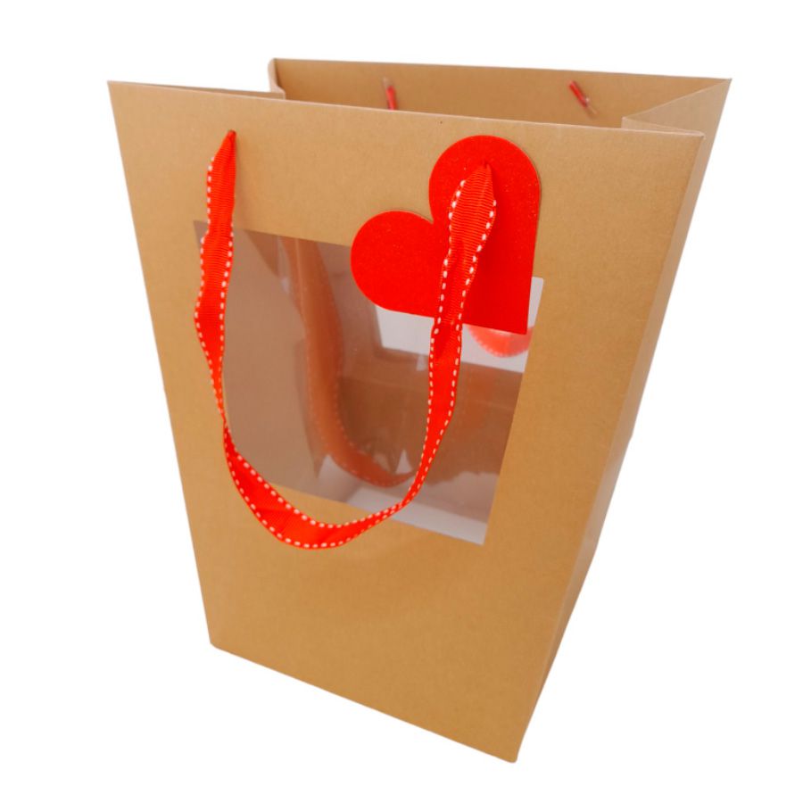 Sacola de Papel kraft com visor nas duas laterais e alça vermelha com detalhes brancos e tag de coração vermelha