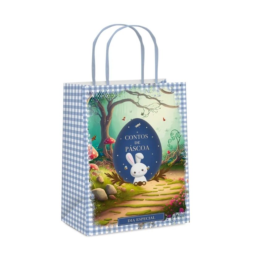 A Sacola De Papel De Páscoa - Contos De Páscoa Azul é uma embalagem encantadora e temática, perfeita para dar um toque especial aos presentes e produtos de Páscoa. Com sua cor azul delicada e design inspirado nos contos de Páscoa, ela transmite uma sensação mágica e acolhedora.