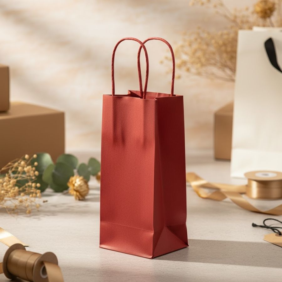 Sacola de papel kraft vermelha para mini garrafas, 9,5x7,5x23cm. Resistente, ecológica e sofisticada, ideal para presentes, brindes e lembranças personalizadas.
