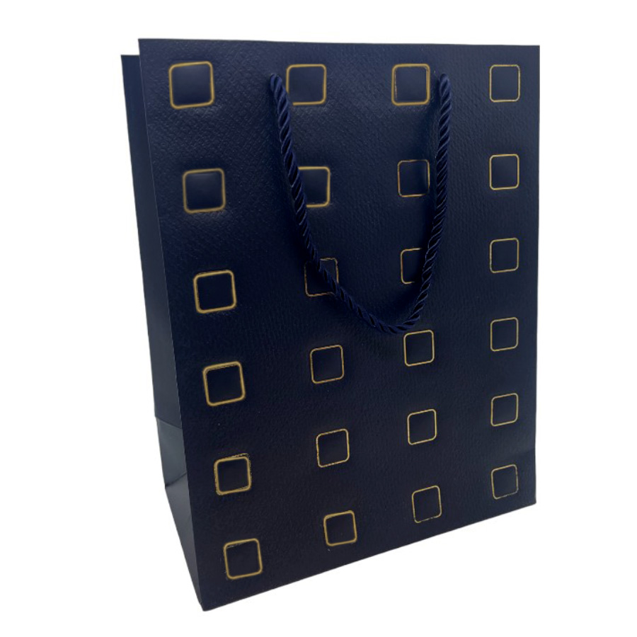 Sacola de papel para presente na cor azul escuro, com desenhos de quadrados almofadados com contorno em dourado