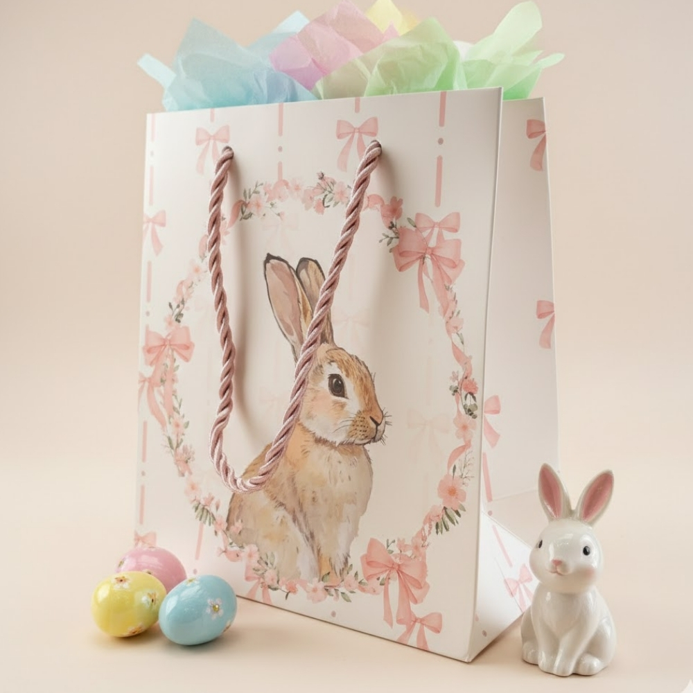 Delicada e encantadora, a sacola de papel premium Candy Rosa é perfeita para composições suaves e cheias de charme na Páscoa. Com fundo branco, a estampa central traz um coelhinho bege fofo, envolvido por uma delicada guirlanda de laços e flores rosa, criando um visual doce, leve e romântico. Os laços rosa se repetem por toda a sacola, reforçando a identidade delicada e harmoniosa da estampa.