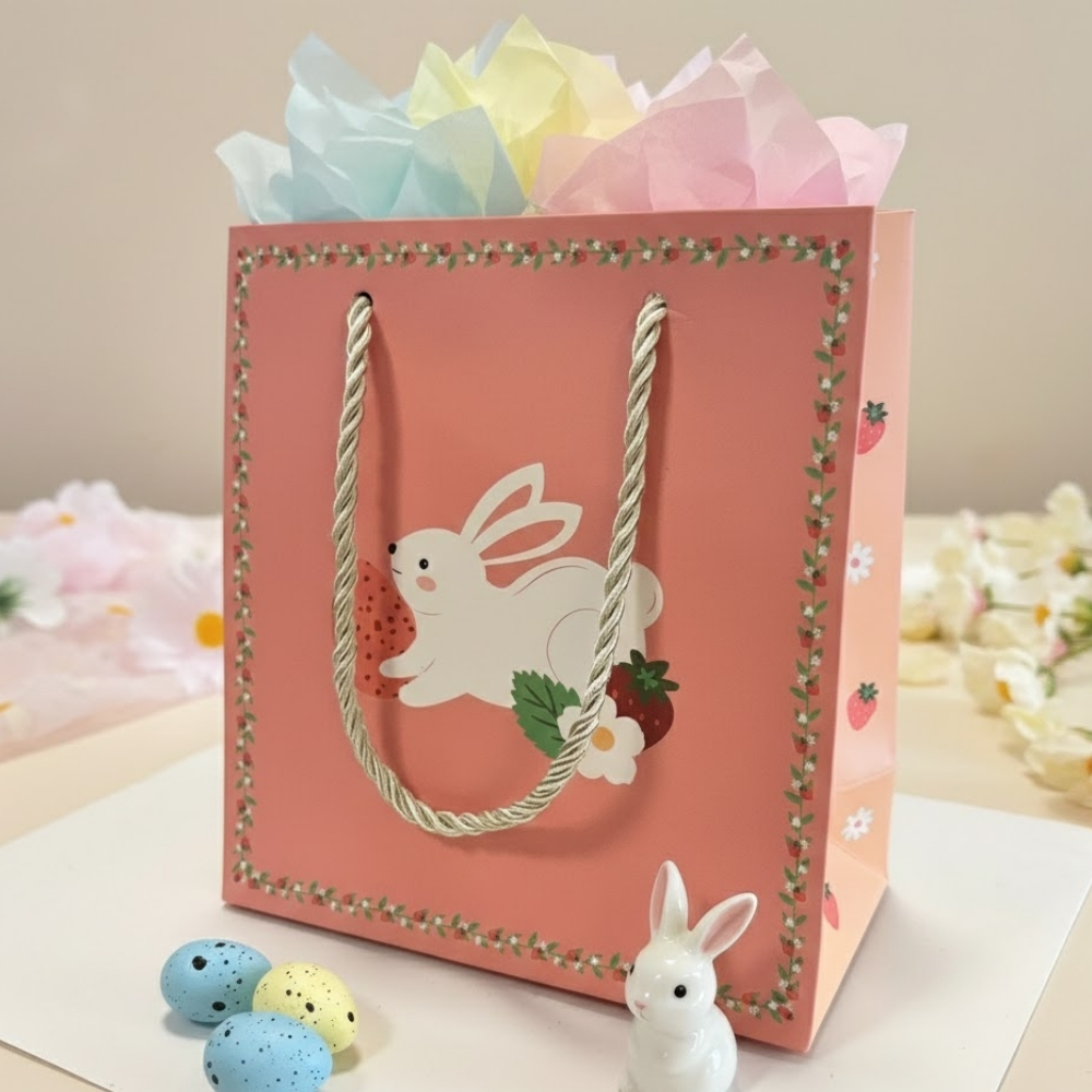 Delicada e encantadora, a sacola de papel premium Morango Pop Rosa é perfeita para composições especiais de Páscoa. Com fundo rosa, a estampa central apresenta um coelhinho branco, acompanhado por morangos e uma flor, criando um visual doce, leve e alegre. Toda a borda da sacola é ricamente decorada com ramos de flores e morangos, trazendo charme e riqueza de detalhes à peça.