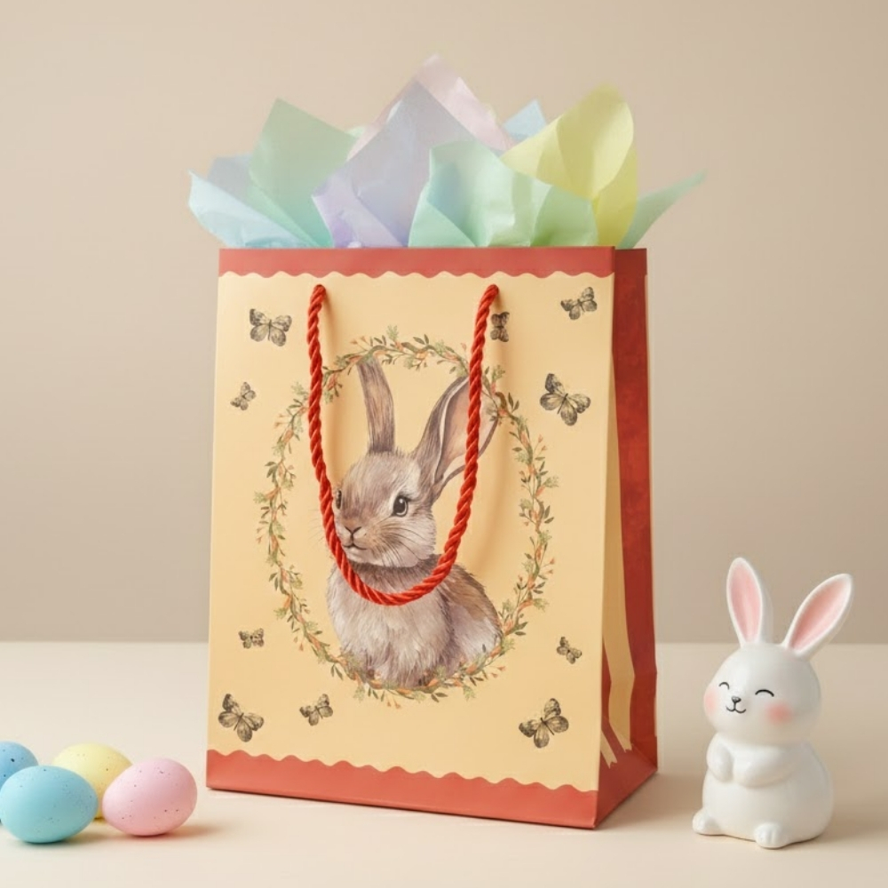 Charmosa e com um visual natural, a sacola de papel premium Rústico Laranja é ideal para composições de Páscoa com estilo acolhedor e campestre. Com fundo bege e bordas em tom terroso de laranja, a sacola apresenta um design equilibrado e sofisticado. A estampa central traz um coelho delicadamente ilustrado, cercado por galhos com cenouras e borboletas, criando uma composição leve, lúdica e harmoniosa.