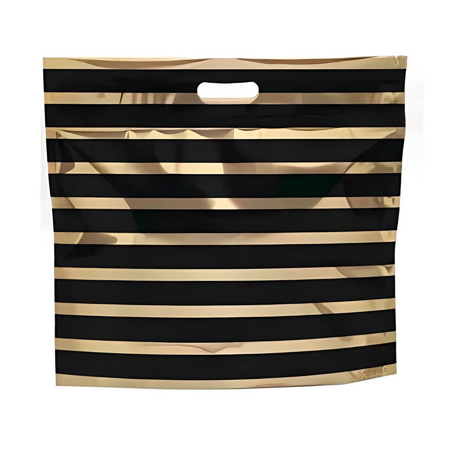 Eleve o estilo das suas compras com a Sacola Metalizada com Zip - Listras Preto/Ouro. Seu design elegante e as listras em preto e ouro conferem um toque de sofisticação a qualquer ocasião.