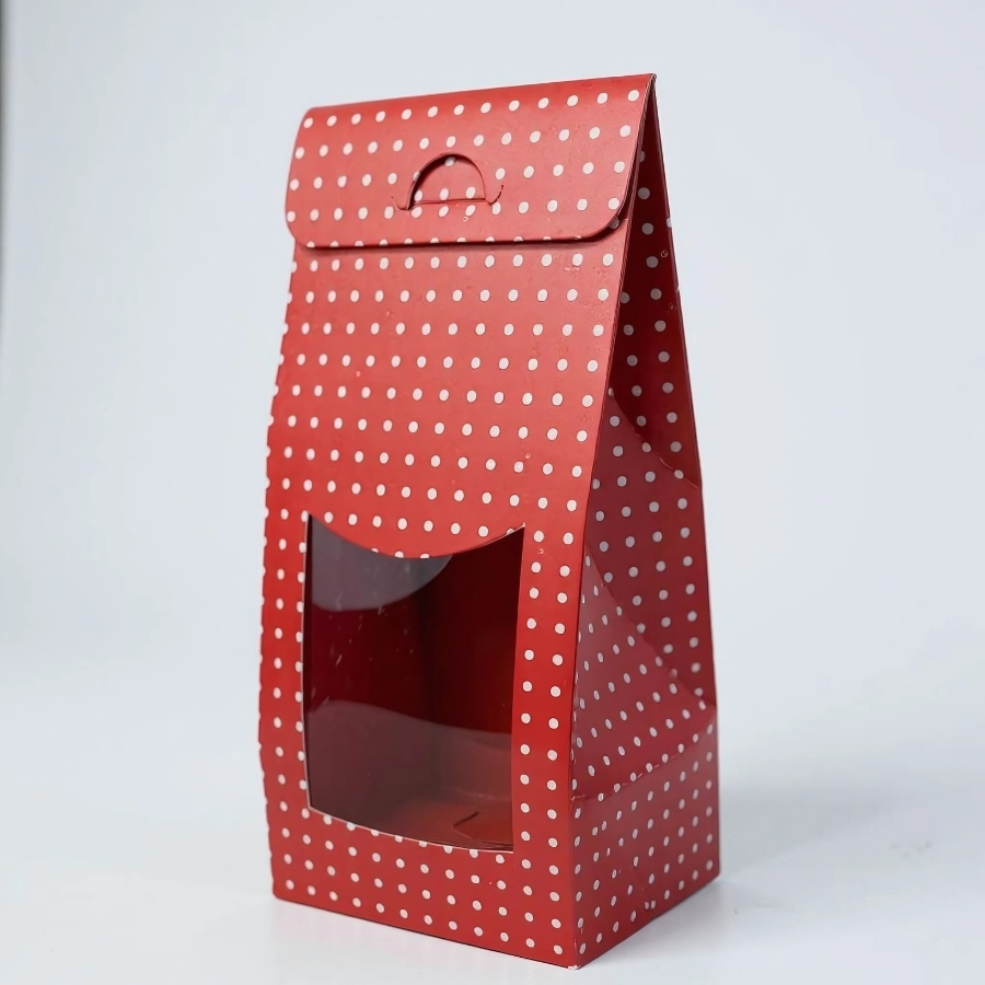 Sacola pequena de papel com visor em acetato, na cor vermelha com estampa de bolinhas brancas. Mede 7,5x19x6cm. Possui alças resistentes. Ideal para lembrancinhas, doces ou pequenos presentes.