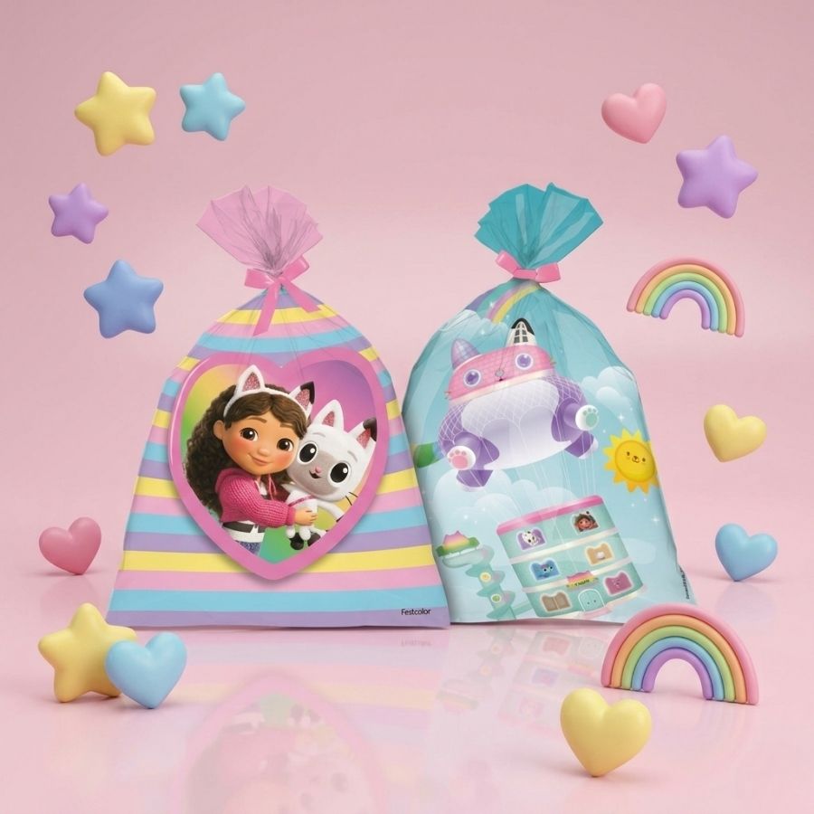 O diferencial da Sacola Plástica A Casa Mágica da Gabby está na sua estampa temática infantil, que valoriza a decoração e reforça a identidade visual da festa. Leve e funcional, facilita a montagem de kits festa, sacolinhas surpresa e lembrancinhas personalizadas, agregando valor à produção. Seu tamanho versátil permite diversas combinações de itens, contribuindo para uma apresentação colorida, criativa e profissional em eventos infantis.