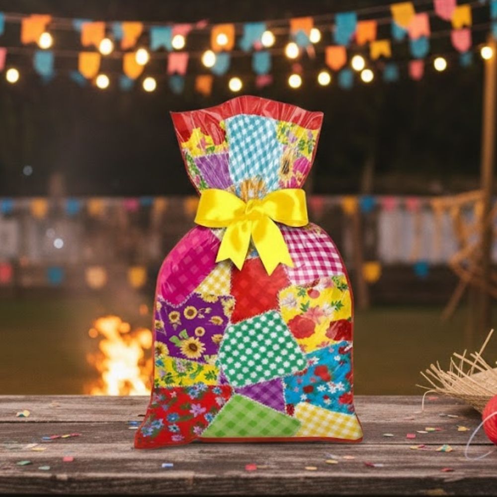 Possui estampa inspirada em retalhos de tecido típicos juninos, com aquele visual colorido e caricato que remete às tradicionais festas de São João. A sacola temática deixa qualquer entrega mais charmosa e dentro do clima caipira.