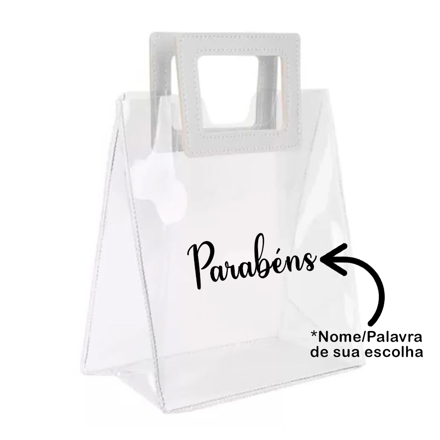 Sacola de plástico transparente com alça tipo couro quadrada, na cor azul, personalizada com nome ou palavra de sua escolha.