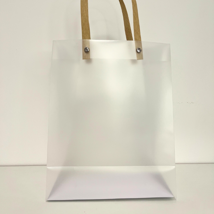 Sacola Transparente Fosca PVC com Alça de Fibra 25x20x10cm, elegante e resistente, ideal para presentes e embalagens sofisticadas.