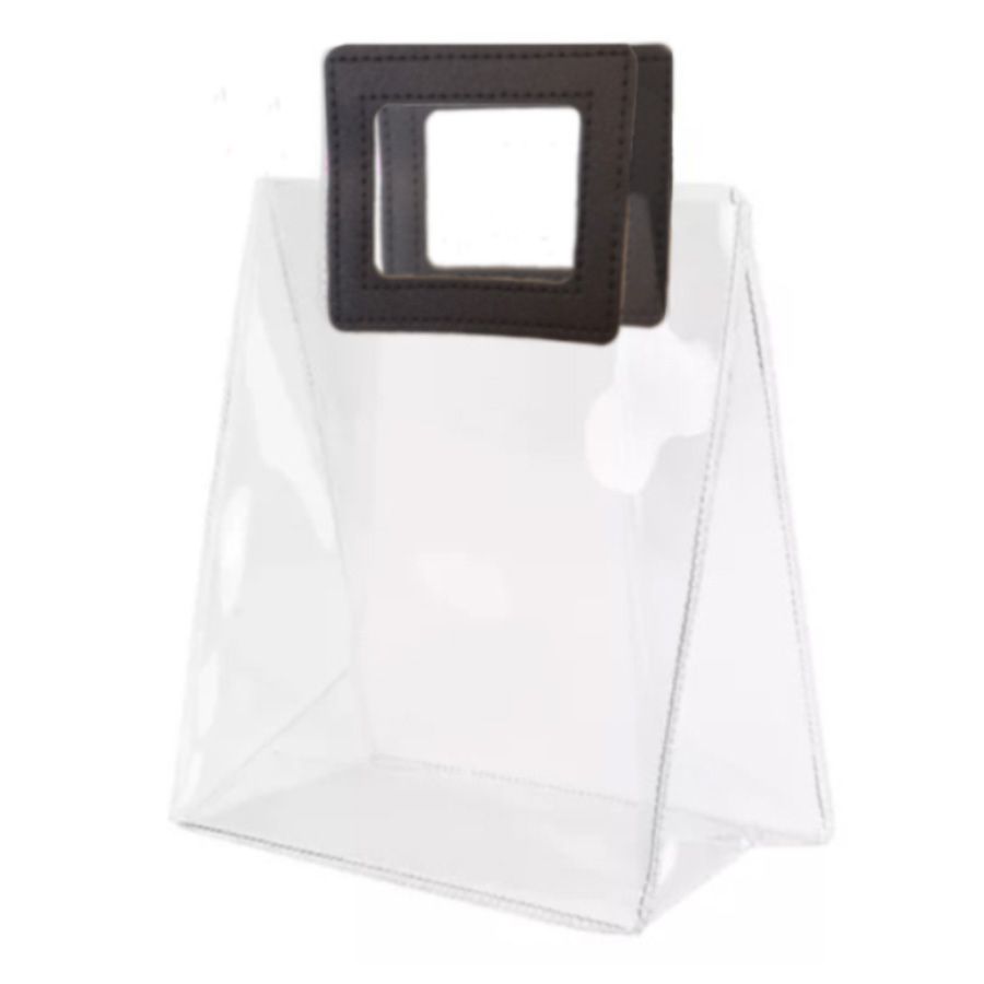 Sacola Quadrada Transparente de Plástico com alça quadrada de couro na cor preta