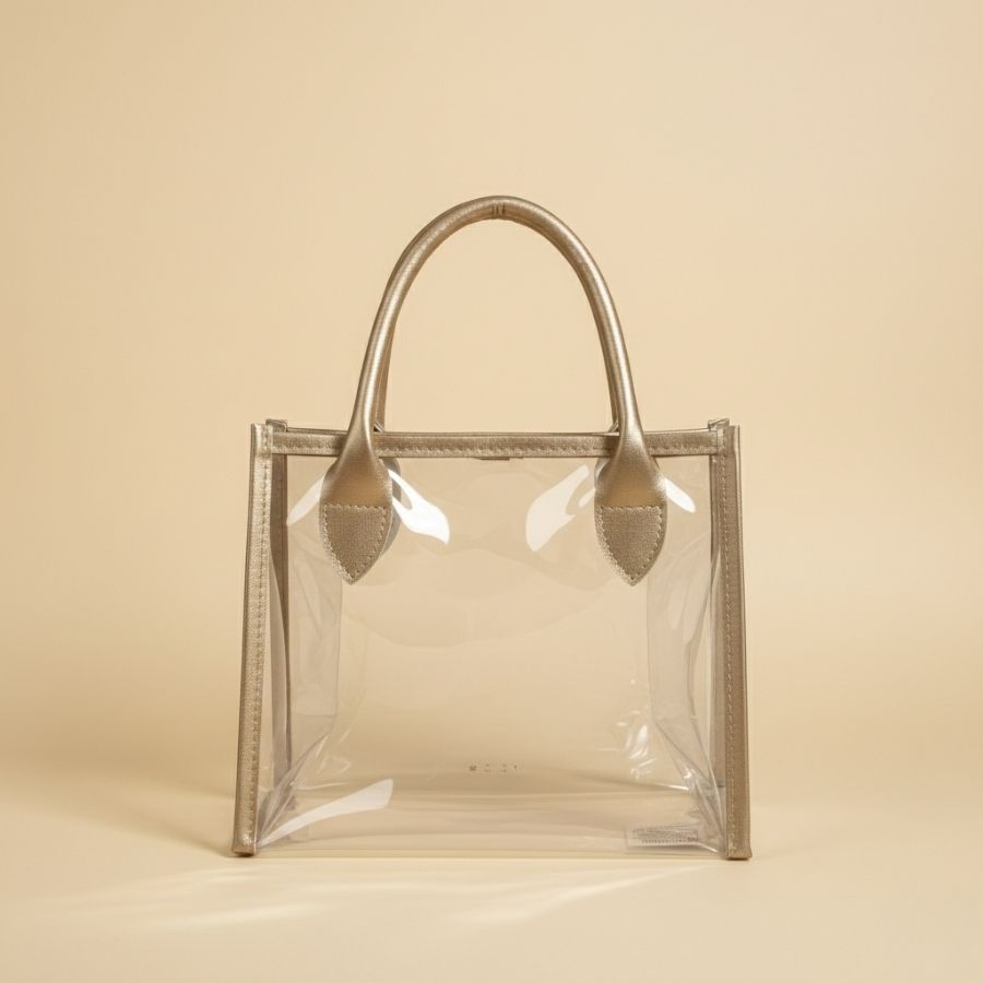 Sacola transparente em PVC com alça dourada em PU, tamanho 22x11x19 cm, resistente e ideal para presentear, organizar e valorizar produtos.