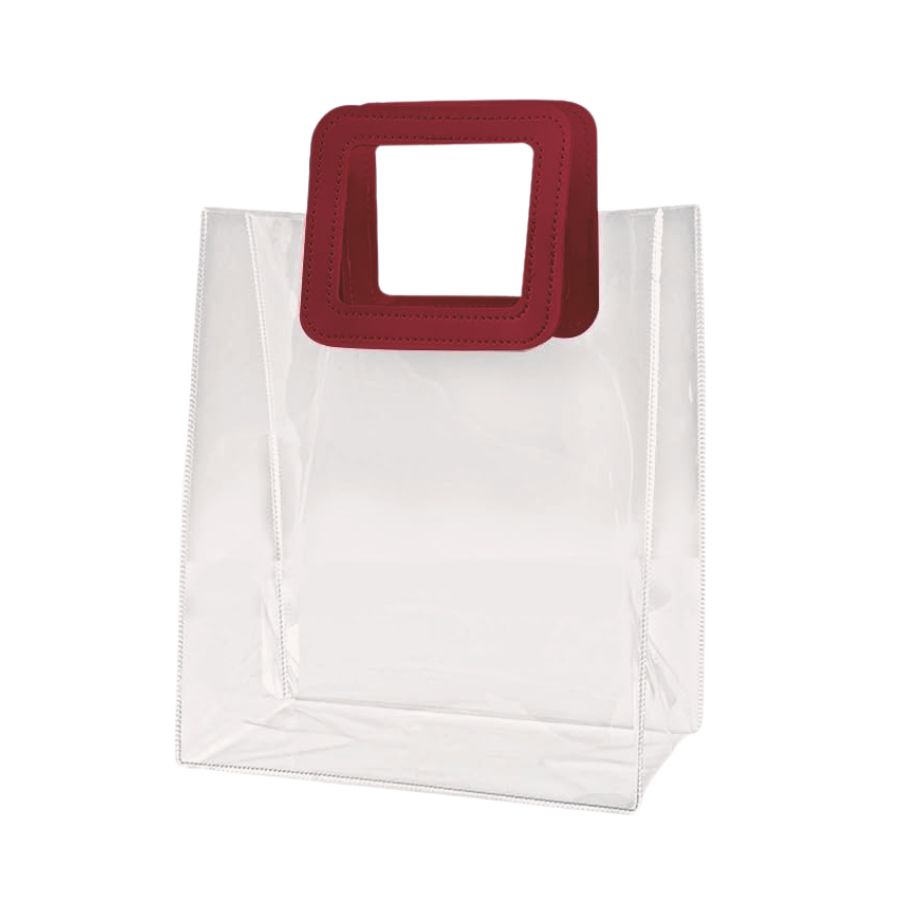 Sacola Quadrada Transparente de Plástico com alça quadrada de couro