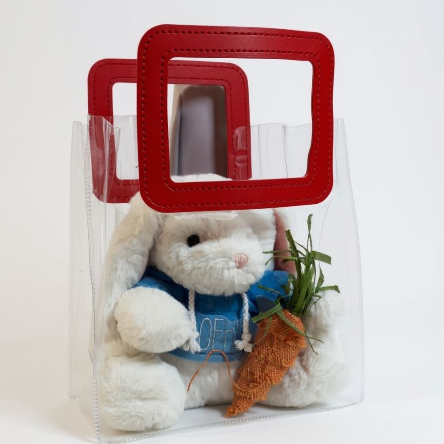 A Sacola Transparente Fosca PVC com alça retangular em couro vermelho é resistente, prática e sofisticada, ideal para lembrancinhas, presentes e embalagens de festas e eventos.