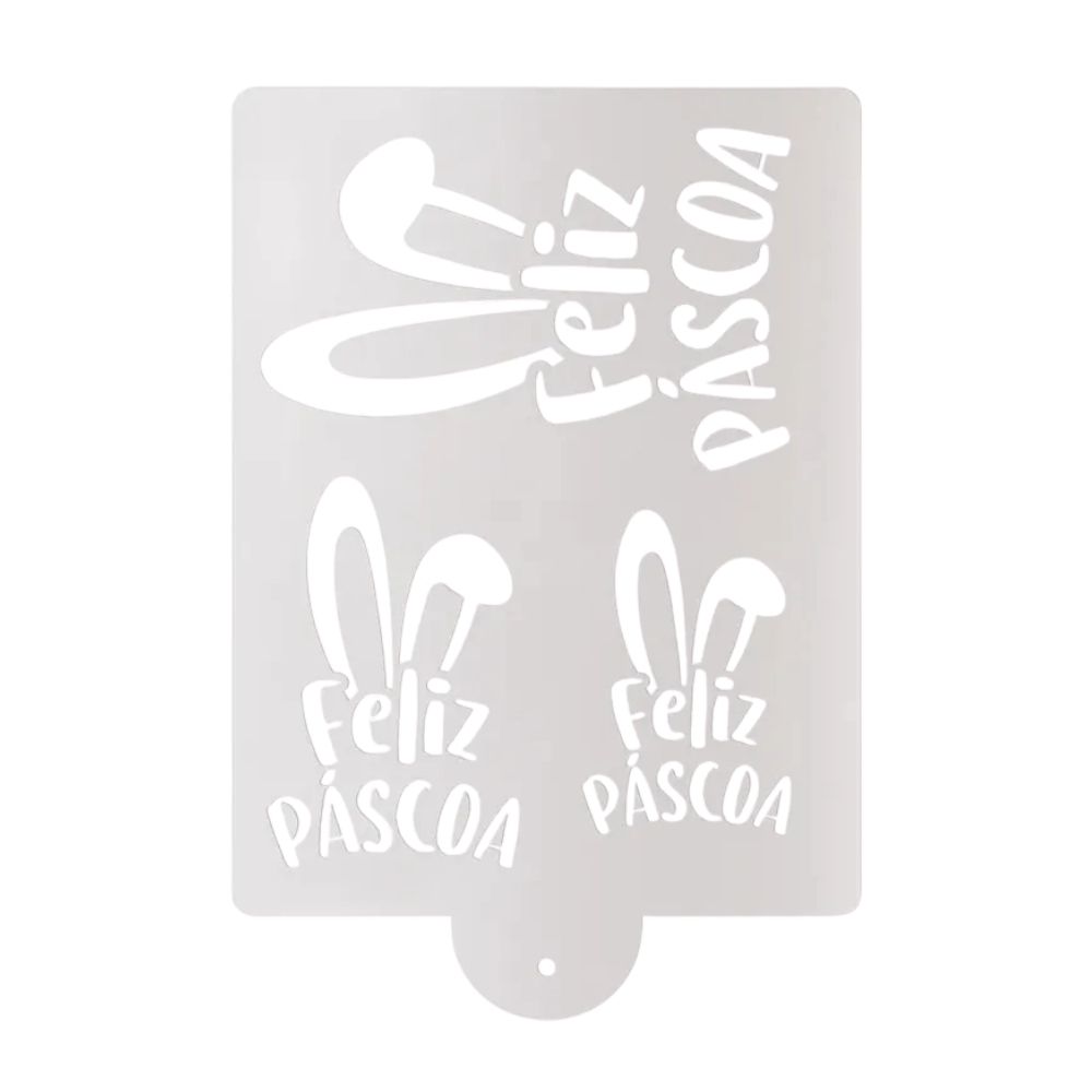 O stencil de Páscoa com a frase “Feliz Páscoa” traz o texto em diferentes tamanhos, acompanhado de um delicado par de orelhinhas de coelho acima das palavras, criando um efeito temático e encantador. Com medidas aproximadas de 15x20cm, é ideal para personalizar doces e embalagens com um toque criativo.