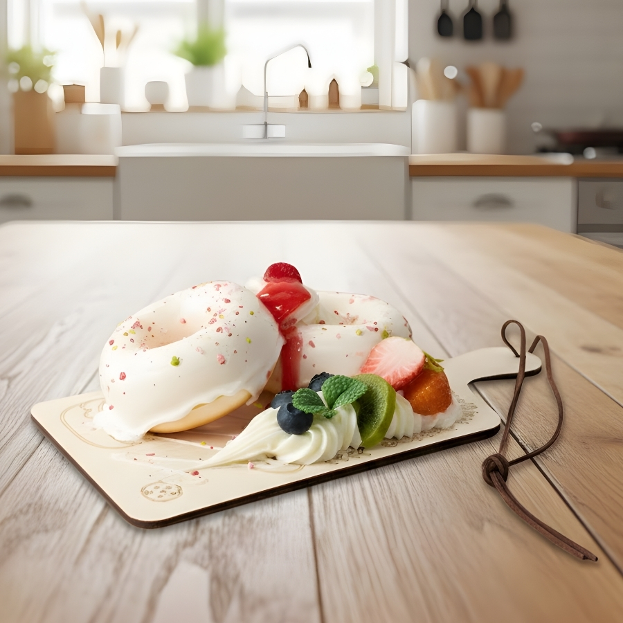 O produto é um enfeite decorativo com imã, em formato de tábua de donnuts com frutas, com tamanho de 23cm. É indicado para uso decorativo em superfícies metálicas, vitrines e composições temáticas.