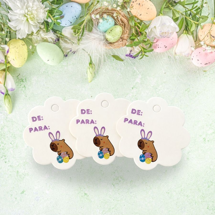 Tags de Feliz Páscoa com tema de capivara para colocar em doces, ovos de páscoa, lembrancinhas e presentes de páscoa