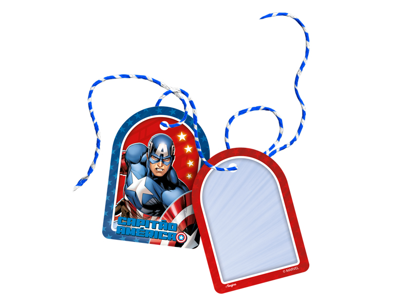 Tag com cordão, ideal para personalizar lembrancinhas e decorar sua festa com a estampa licenciada Disney do Capitão América.