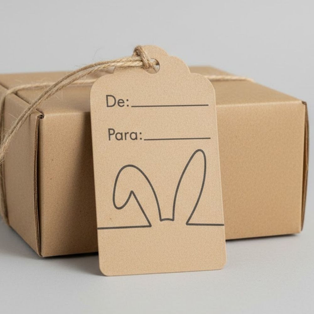 A Tag de Páscoa Artesanal em formato de orelhas de coelho é o detalhe perfeito para deixar seus presentes ainda mais delicados e personalizados. Produzida em estilo kraft, possui o espaço escrito "de: ___ para: ___", facilitando a identificação e trazendo um toque especial e afetivo às embalagens. Com aproximadamente 7x4cm, tem tamanho ideal para complementar caixas, sacolas e lembrancinhas.
