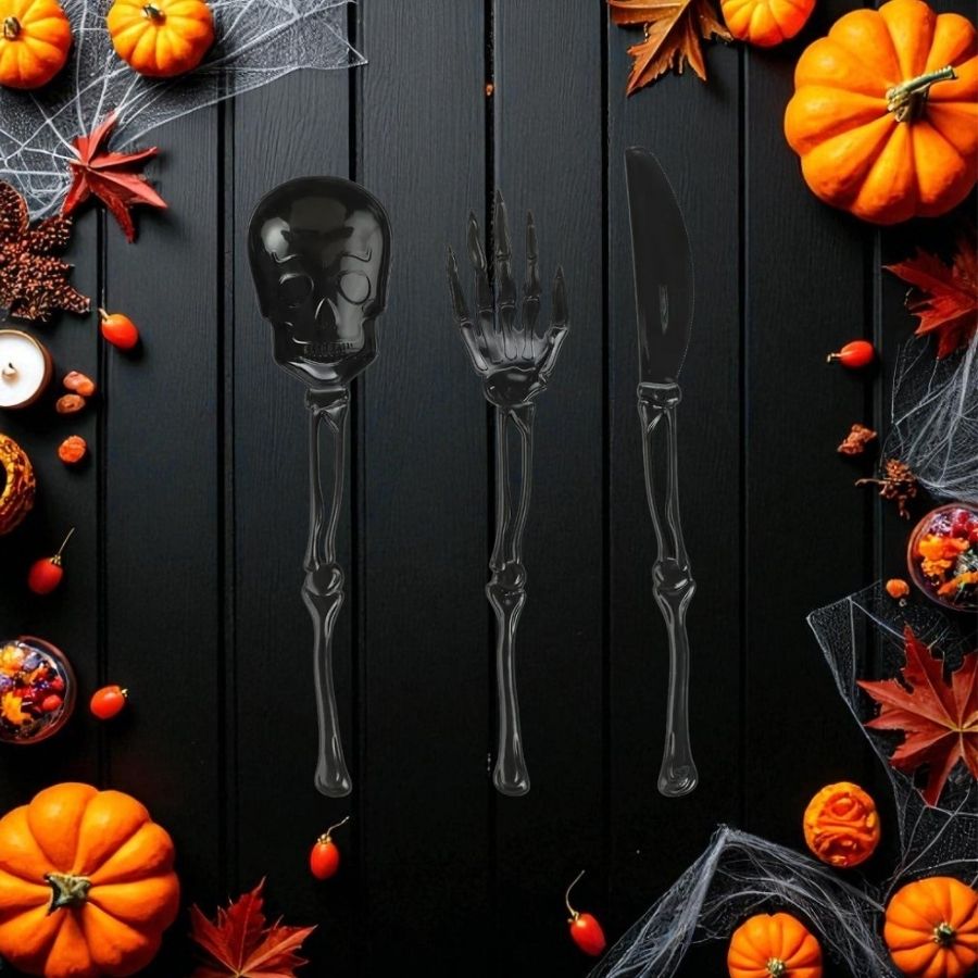 Talheres de plástico com design esqueleto, disponíveis nas cores branco e preto, medindo 18x2cm. Ideais para festas de Halloween e eventos temáticos.