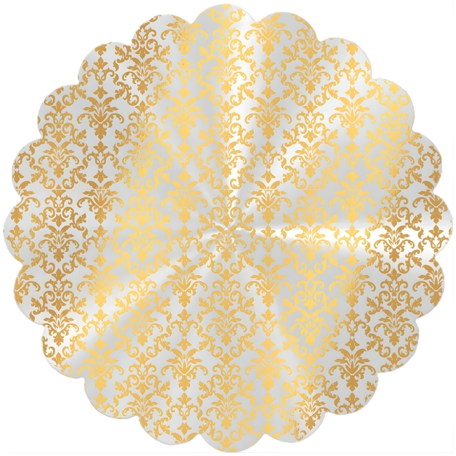 O Tapetinho Para Doces Arabesque Ouro possui 9cm de diâmetro e é indicado para apoio e decoração de doces. Seu modelo decorativo em arabesco contribui para uma apresentação mais elegante, sendo ideal para confeitaria, eventos e montagem de kits e embalagens presenteáveis.