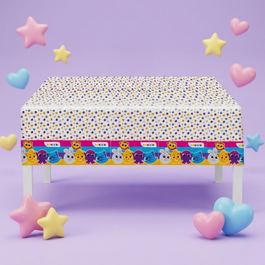 Toalha plástica Bolofofos 120x180 cm, ideal para decorar e proteger mesas em festas infantis com praticidade e tema personalizado.