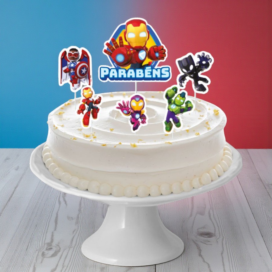 O Topo de Bolo - Homem de Ferro e Seus Amigos - Disney Original é um elemento decorativo pensado para destacar o bolo principal e complementar a identidade visual da festa temática. O conjunto é composto por um item central medindo 11cm e mais 5 figuras menores com média de 7cm, criando uma composição equilibrada e visualmente dinâmica. As figuras são impressas em papel cartão e acompanham haste plástica, facilitando a fixação direta no bolo ou em doces decorativos. A aplicação permite criar camadas visuais e pontos de destaque, valorizando a mesa do bolo e chamando atenção para o tema escolhido de forma prática e organizada.