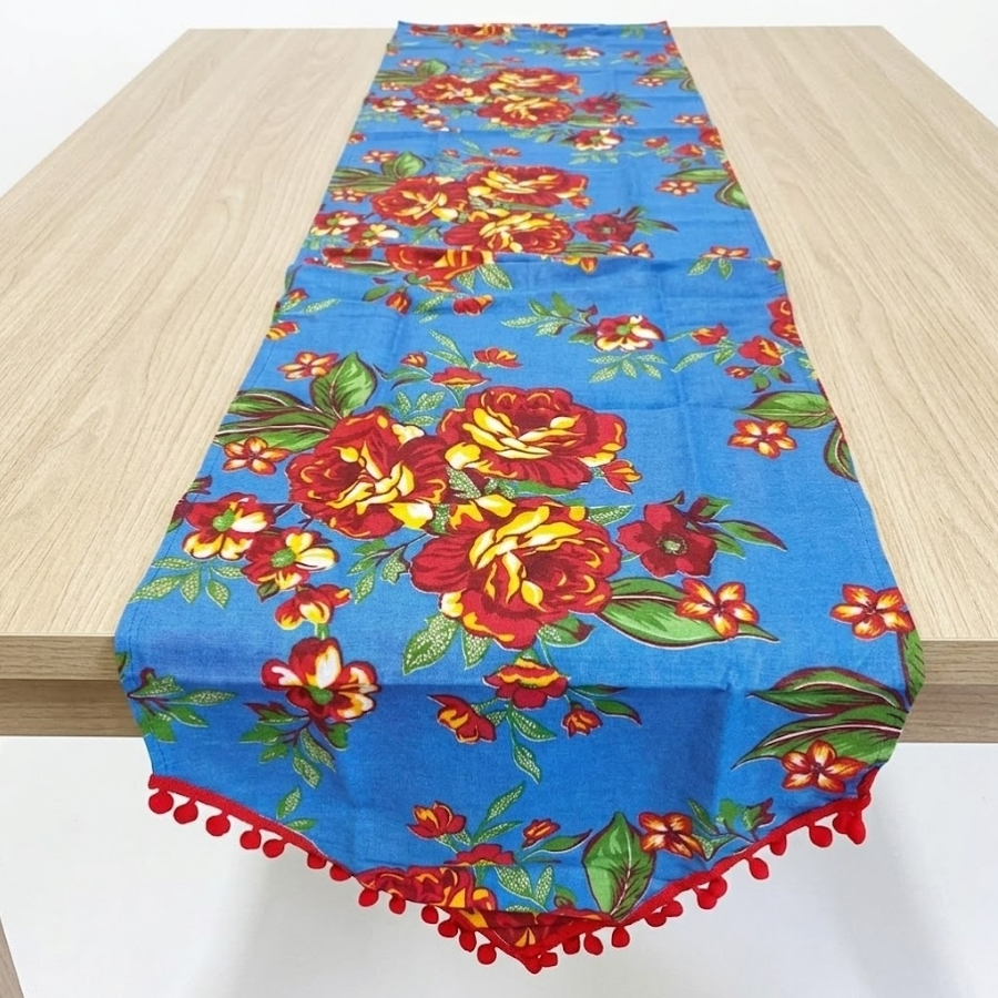 Caminho de mesa com estampa chita nas cores azul, vermelho e amarelo, com padrão floral. Possui dimensões aproximadas de 39x130cm. Indicado para uso decorativo em mesas durante festas juninas e eventos temáticos. Produto leve e de fácil aplicação. Recomenda-se evitar contato com umidade excessiva e objetos que possam danificar o material.
