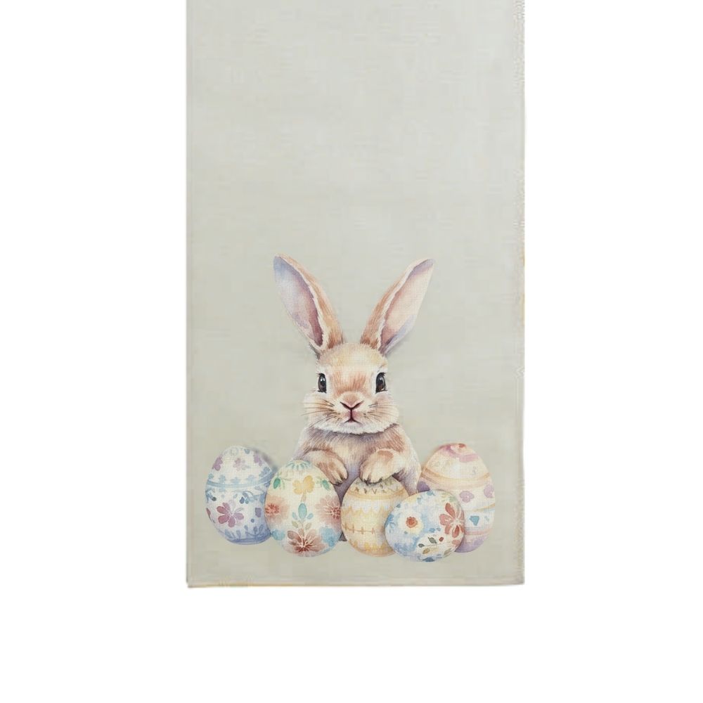 O Trilho de Mesa com estampa de coelho fofo é perfeito para completar a decoração de Páscoa de forma harmoniosa e encantadora. Com fundo bege, traz a mesma estampa do jogo americano, apresentando um delicado coelhinho cercado por ovinhos de Páscoa, criando uma composição alegre, suave e temática.
