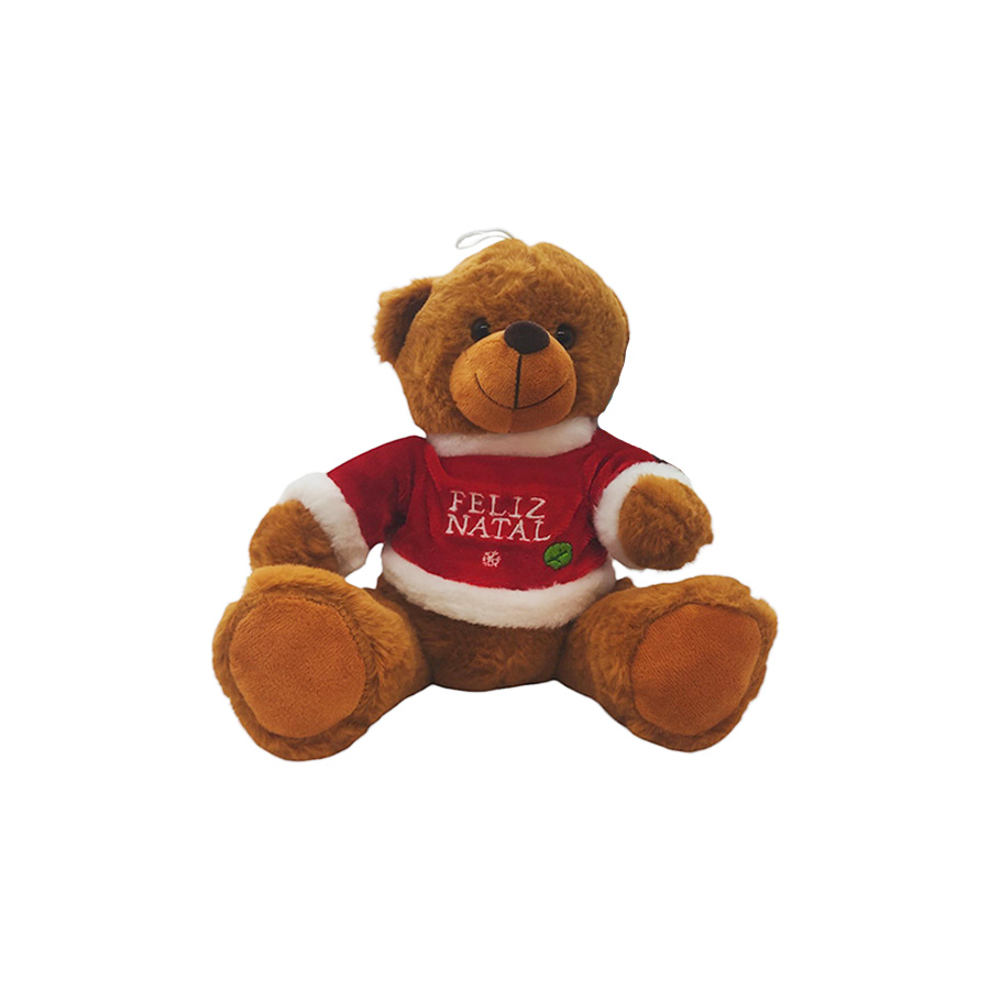 Urso de pelúcia na cor marrom com roupa vermelha escrito "Feliz Natal"