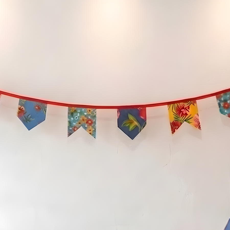 Trata-se de um varal decorativo no estilo chita, composto por 10 bandeiras fixadas em um cordão vermelho, com comprimento total de 270cm. Indicado exclusivamente para uso decorativo. Recomenda-se evitar exposição prolongada à umidade ou intempéries para preservar suas características. Não possui informações adicionais no título sobre resistência a água, calor ou outros fatores específicos. As estampas de chita são sortidas e podem divergir da foto.