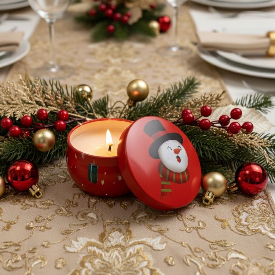 Vela em lata metálica de 70g, perfeita para decorar, aromatizar e presentear durante o Natal, combinando praticidade, segurança e charme.