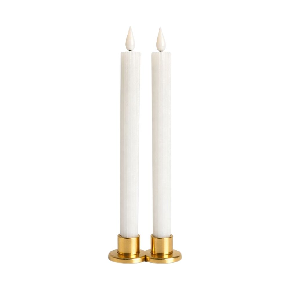 O kit contém 2 velas com iluminação em LED, proporcionando um efeito de chama suave sem o uso de fogo, garantindo mais segurança e praticidade no dia a dia. Para o funcionamento, é necessário desrosquear a base inferior para inserir ou remover as baterias; o botão liga/desliga também fica localizado na parte de baixo. As baterias não estão inclusas.