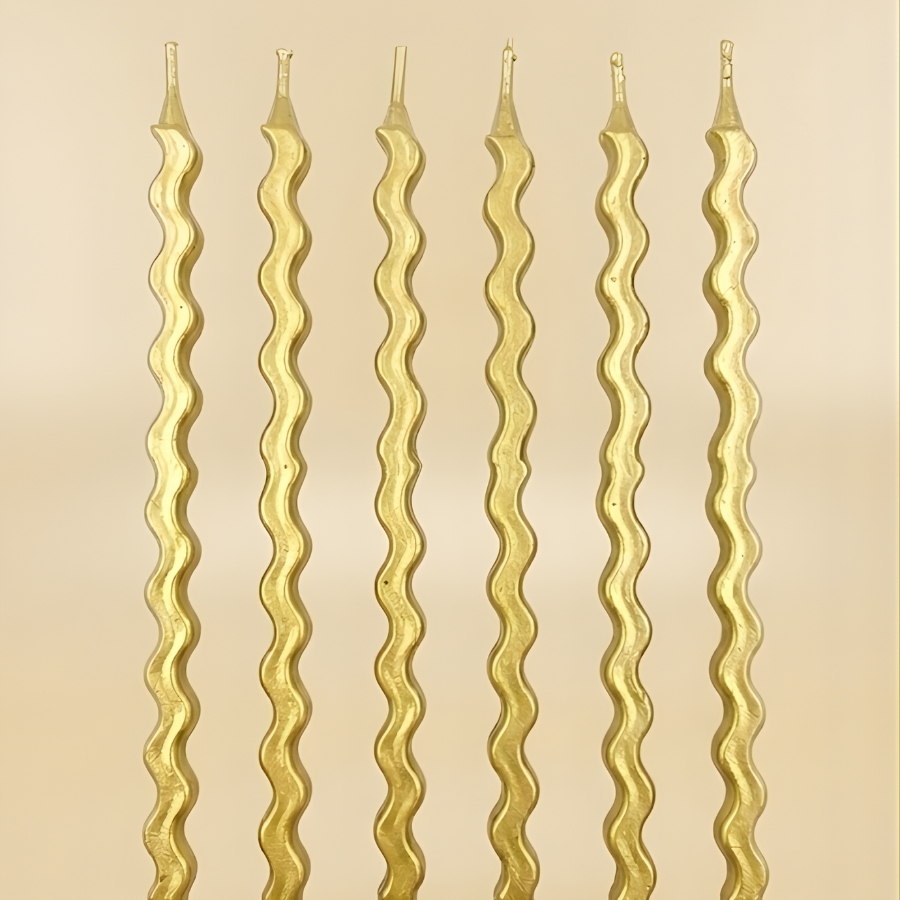 Vela decorativa para bolo com formato ondulado, na cor ouro, com altura aproximada de 12,5cm. Indicada para uso em bolos de aniversário ou composições decorativas em festas e comemorações. Produto destinado ao uso durante celebrações. Recomenda-se posicionar a vela em superfície estável antes de acender, manter afastada de materiais inflamáveis e utilizar sob supervisão de um adulto.